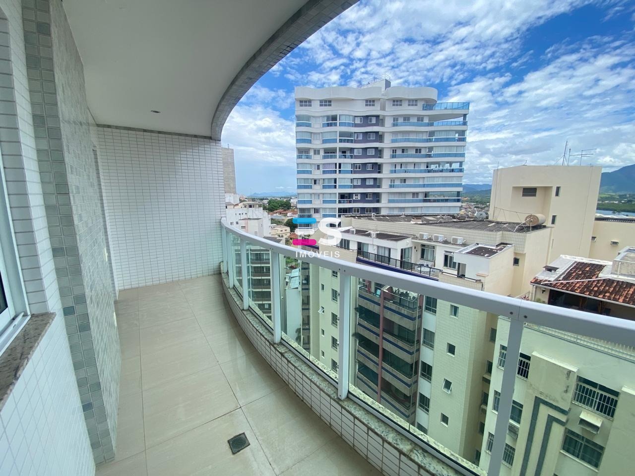 Apartamento à venda no Centro de Guarapari com 2 suites, sala ampla com varanda de frente para a rua, cozinha americana, área de serviço, dependência completa e duas vagas na garagem.