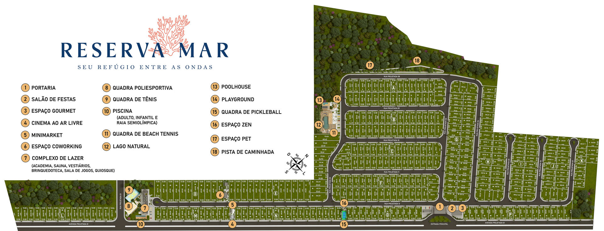 Com lotes a partir de 300 m², o Reserva Mar foi planejado para oferecer o equilíbrio perfeito entre lazer, bem-estar e valorização. São mais de 220 mil m² de área total, com ruas arborizadas, paisagismo diferenciado e um conceito moderno de moradia.